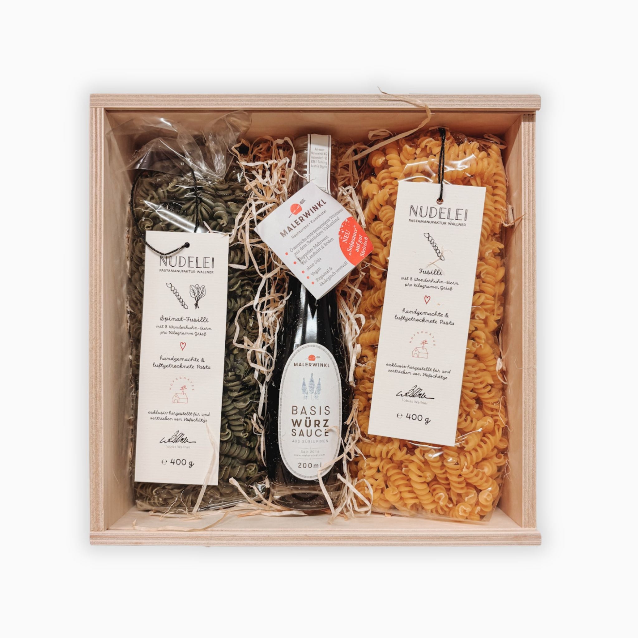 Hölzerne Genussbox mit Eiernudeln und Würzsauce aus Süßlupinen.